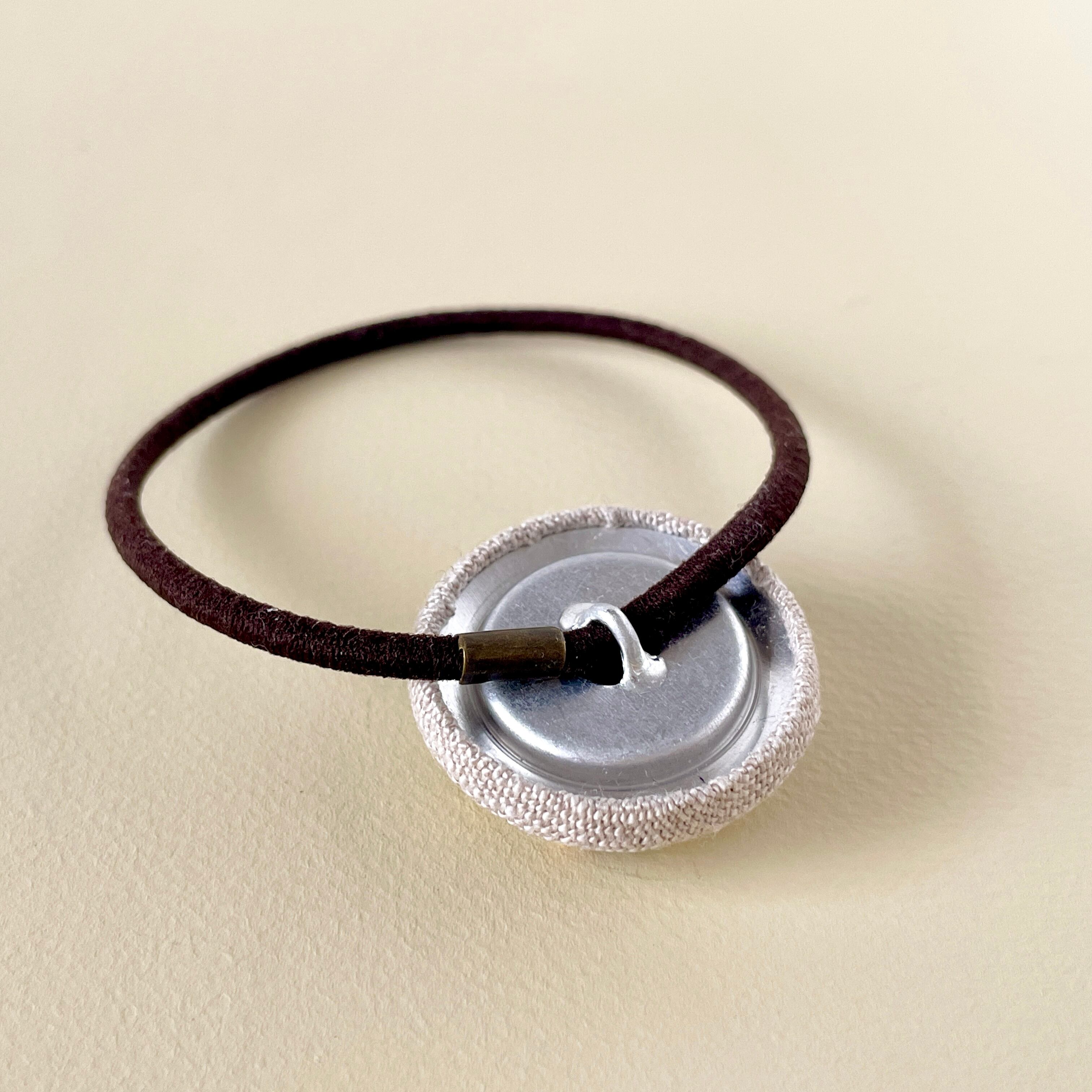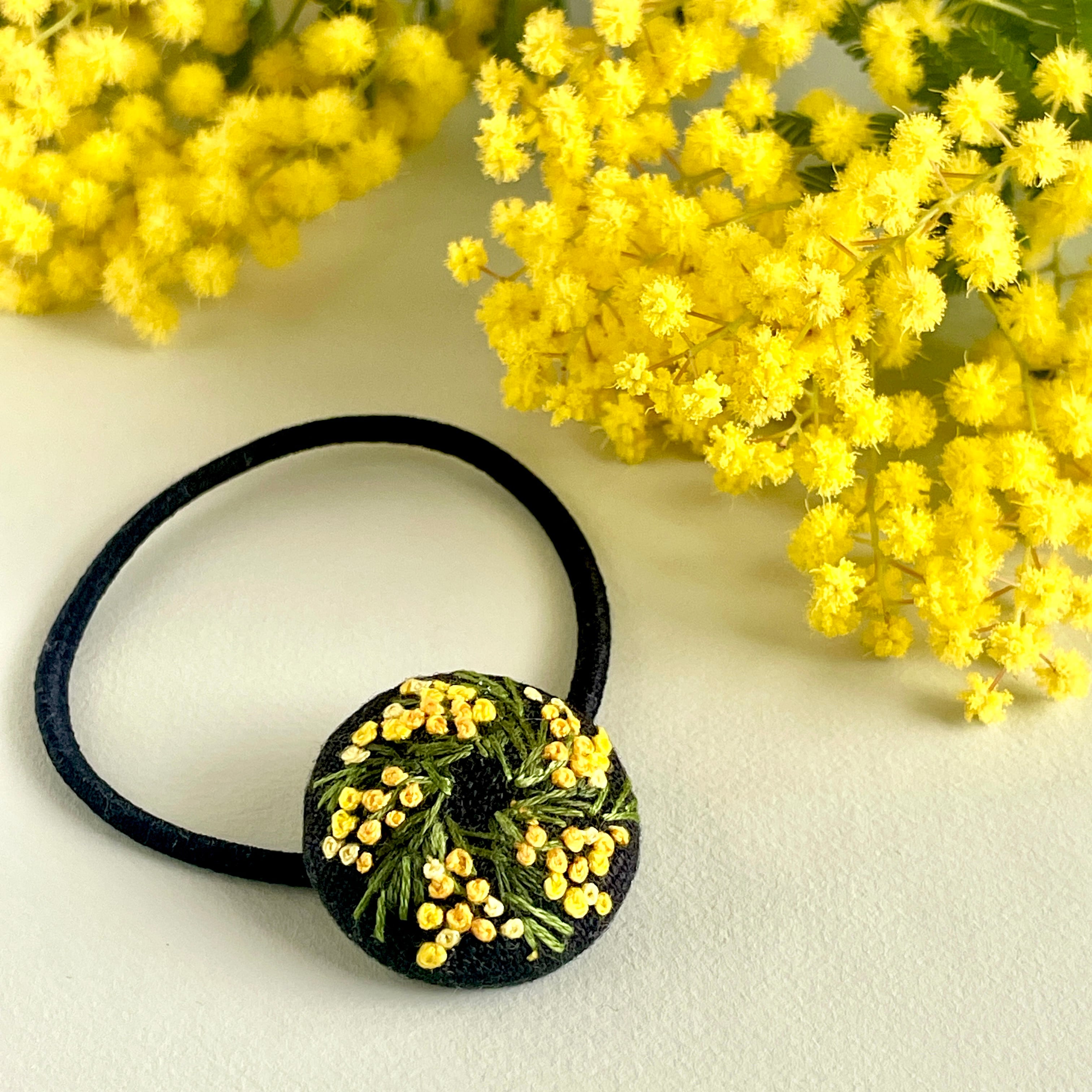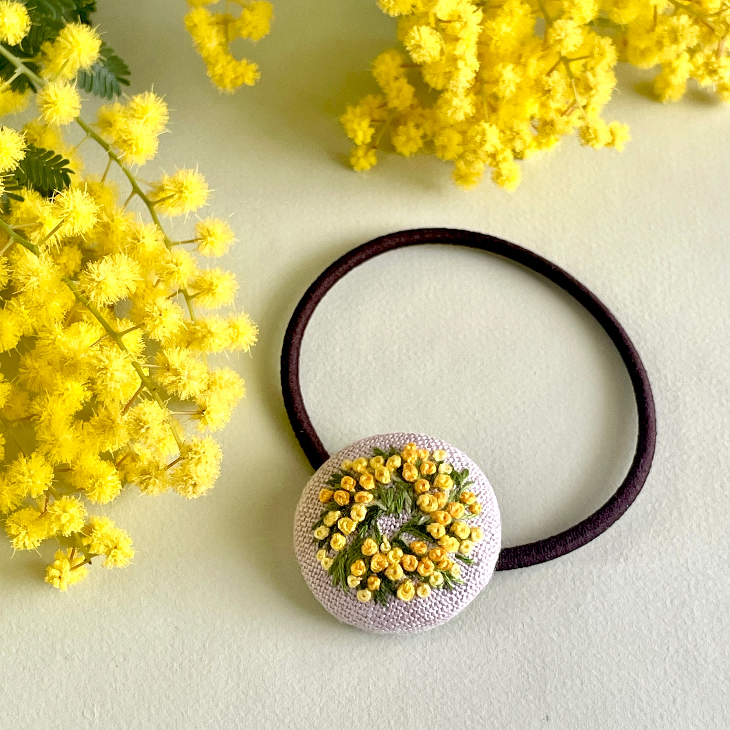 ミモザをイメージして刺繍したくるみボタンのヘアゴムです。